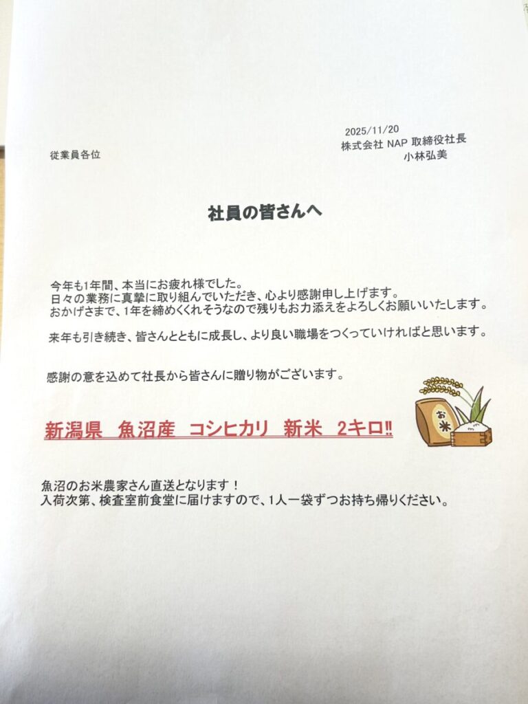 新潟県魚沼産 コシヒカリ‼ By NAP@Admin 2025年11月21日 本日、弘美社長より従業員の皆さんへおいしいお米がプレゼントされました!! 農家さん直送の新米を全員分配ってくださってとっても嬉しかったです。 ありがとうございました。