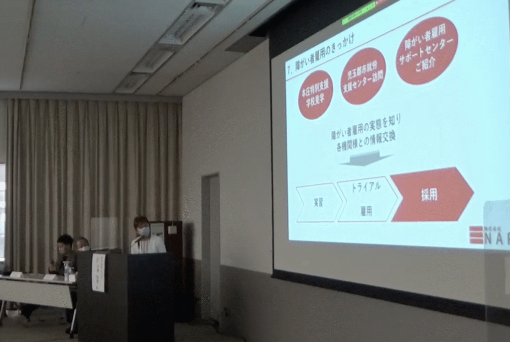 NAPの障がい者雇用のきっかけや流れをお話した後、実際に作業されている方の作業の様子を動画で見ていただきながら実例を紹介しました。